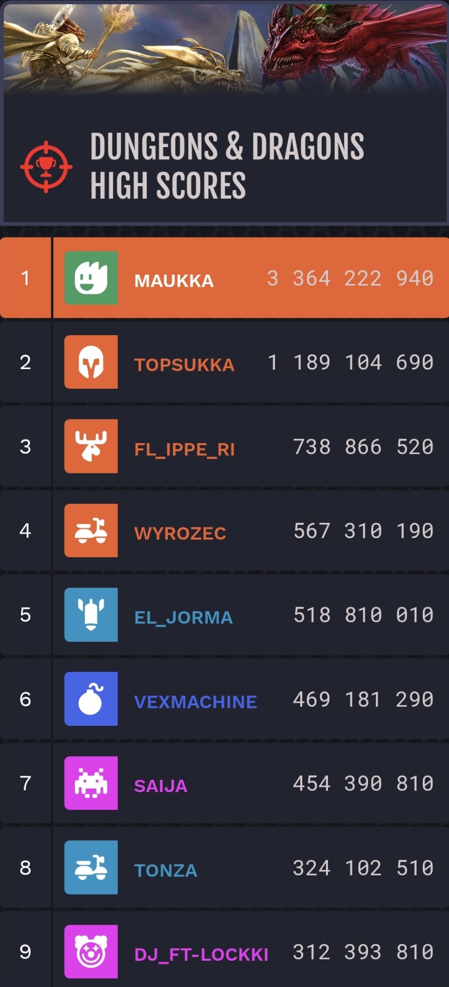 Pelihallimme näytöllä pyörii leaderboard taulukko.